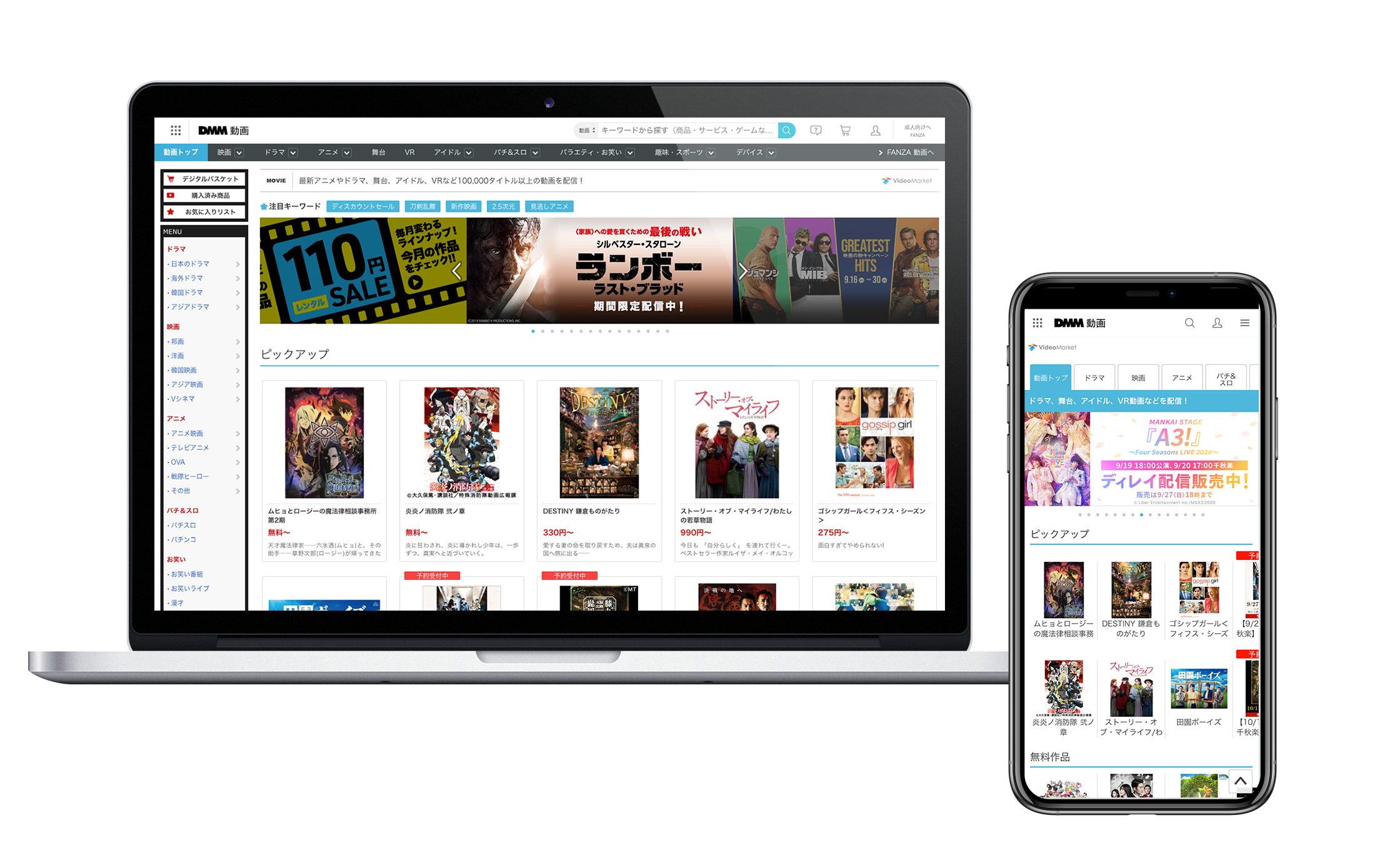 豊富なラインナップの動画を様々なデバイスで楽しむことなどができる動画配信サービス。2.5次元や成人向け動画などは国内最大級の規模を誇る。